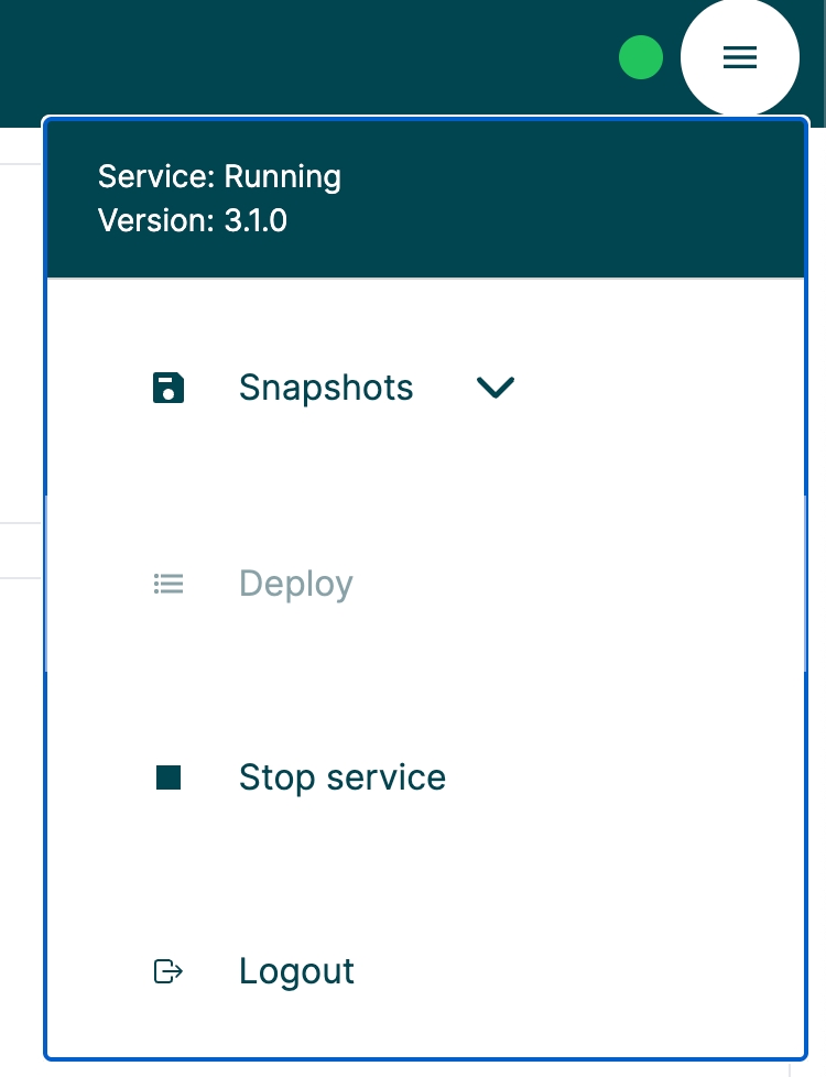 Top right meny provides stop/start, deploy & configuration "snapshotting". Circle left of meny indicates the status of managed service. Green=running, red=not running.